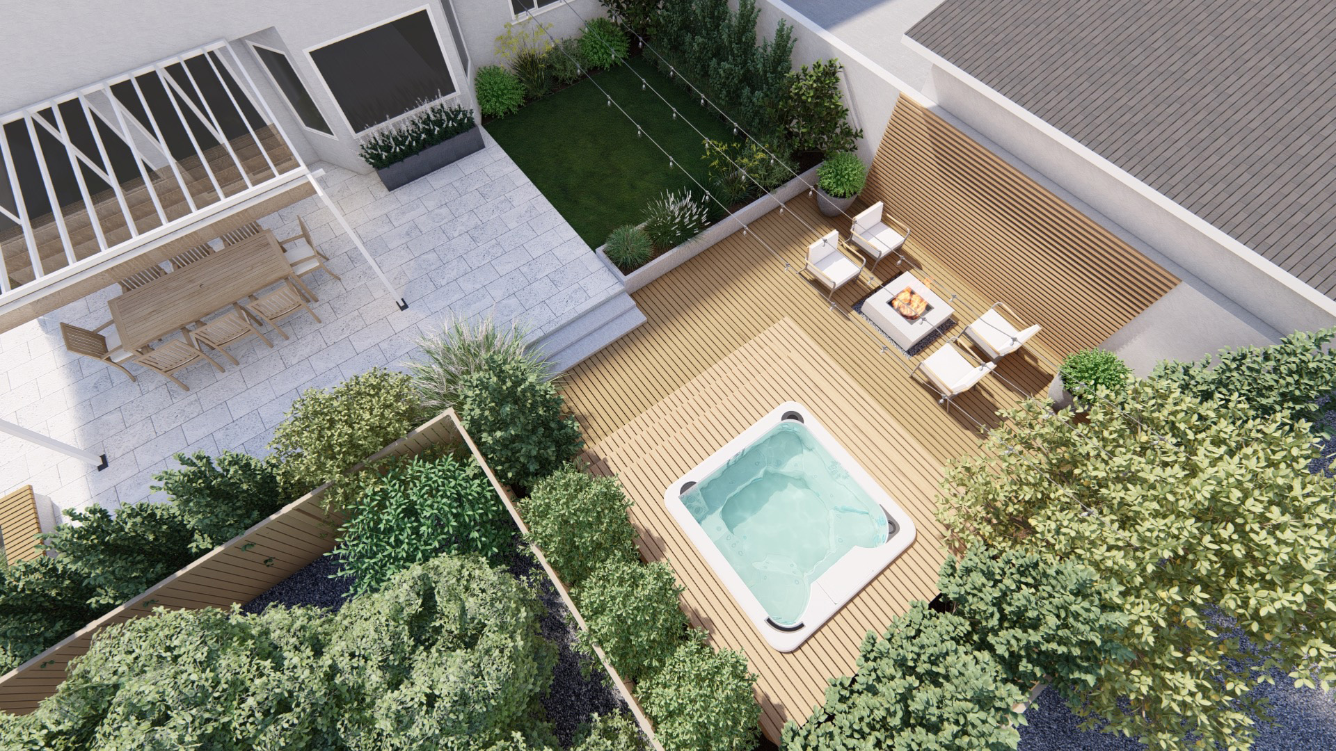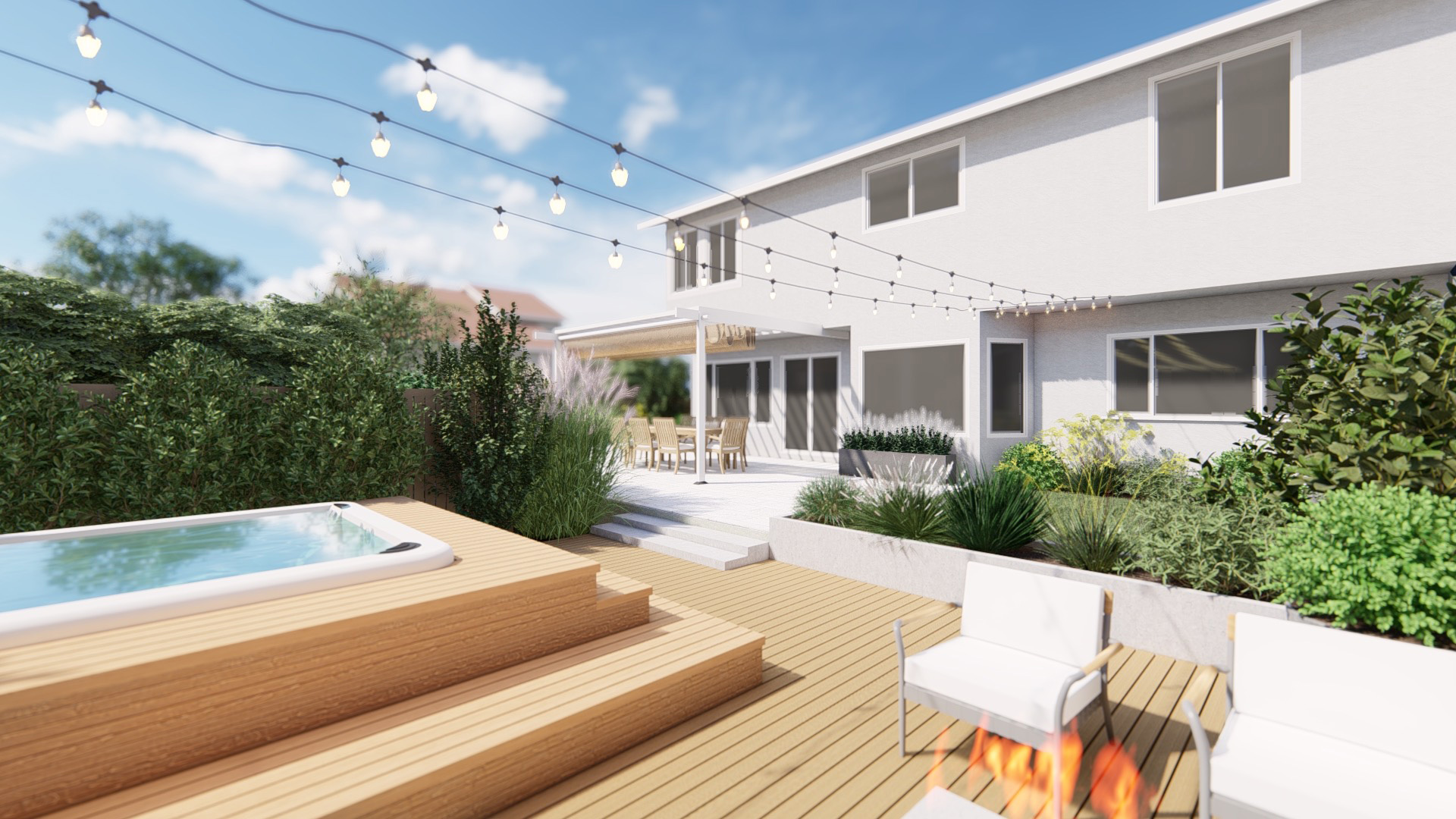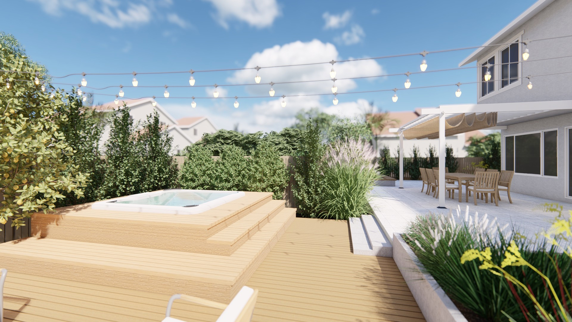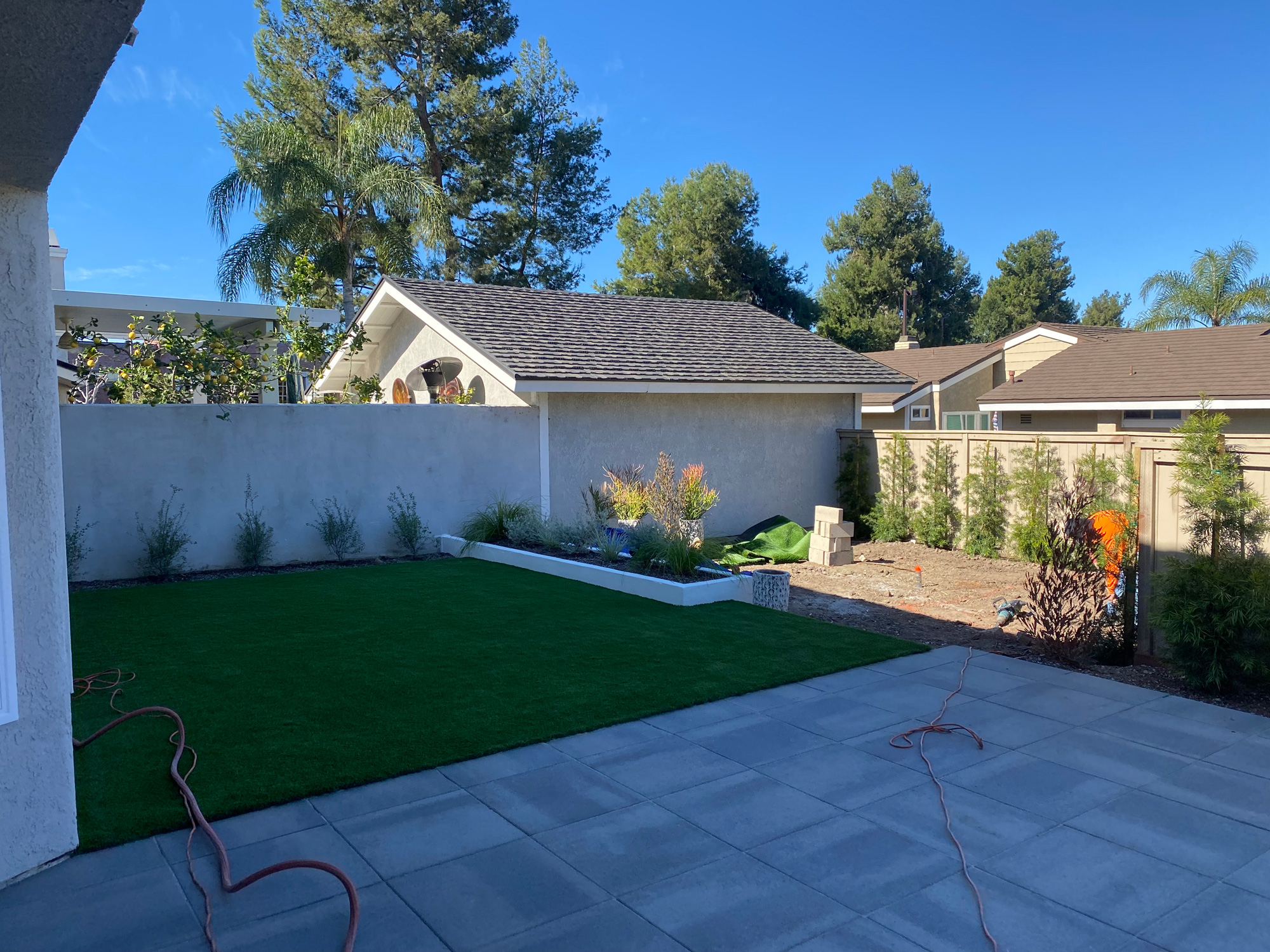 The project included the installation of a durable paver patio, a custom patio cover for shade and protection, decorative stepping stones to connect different areas, strategic landscaping to enhance the space, and a new deck to expand usable outdoor living space.