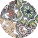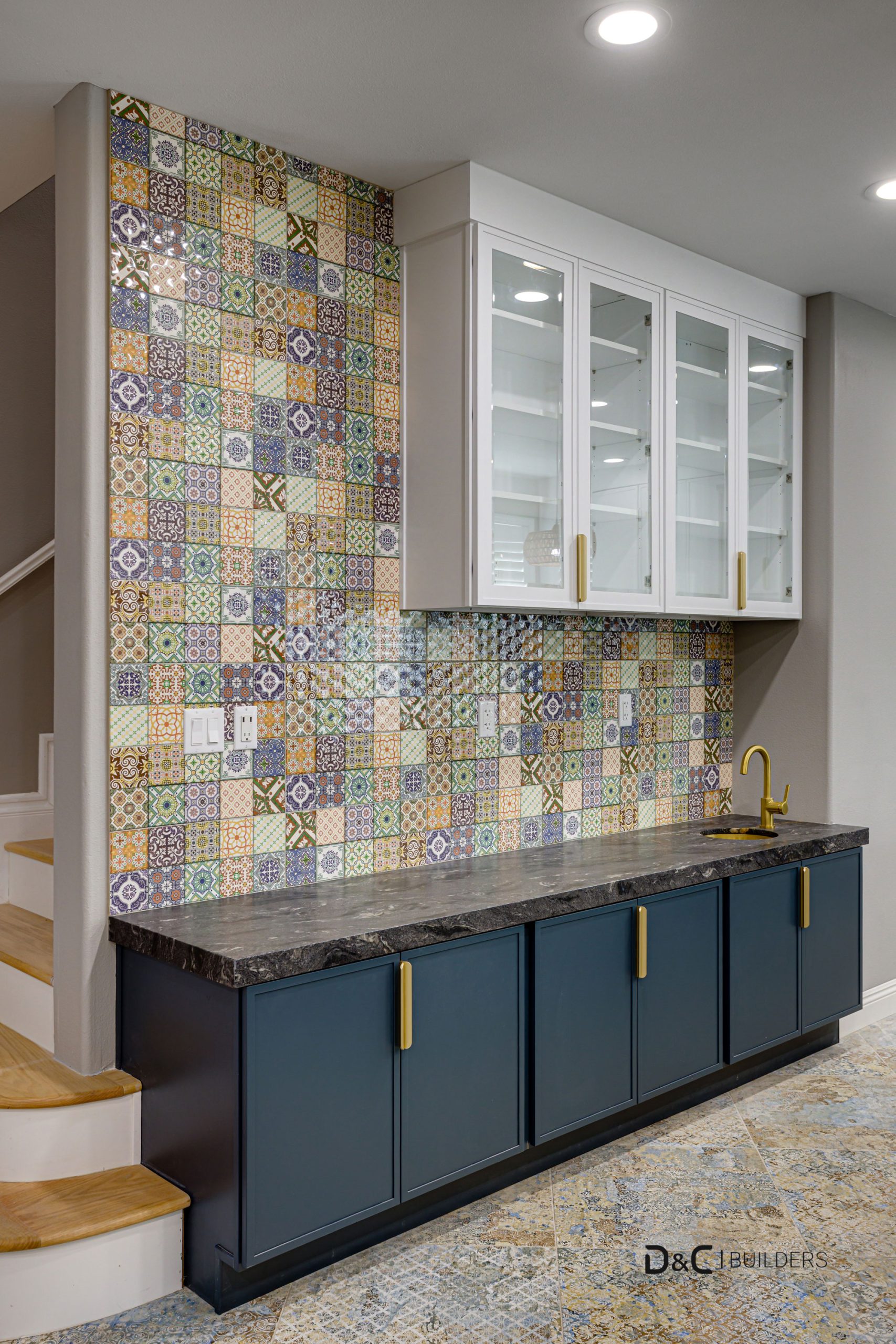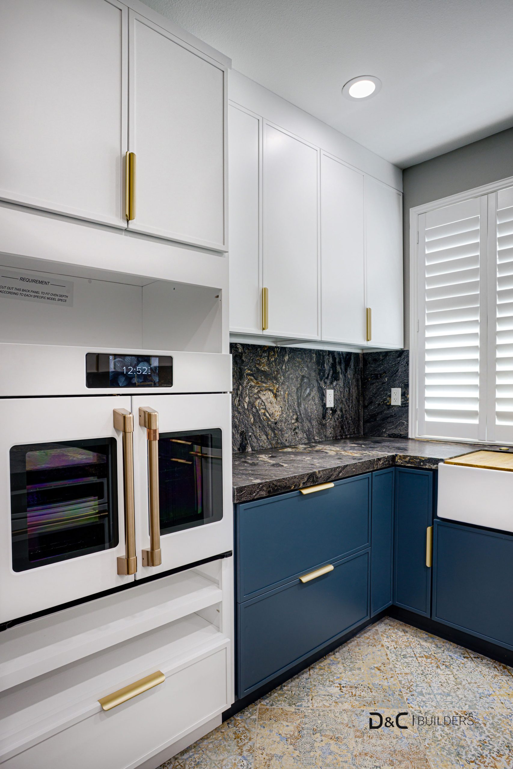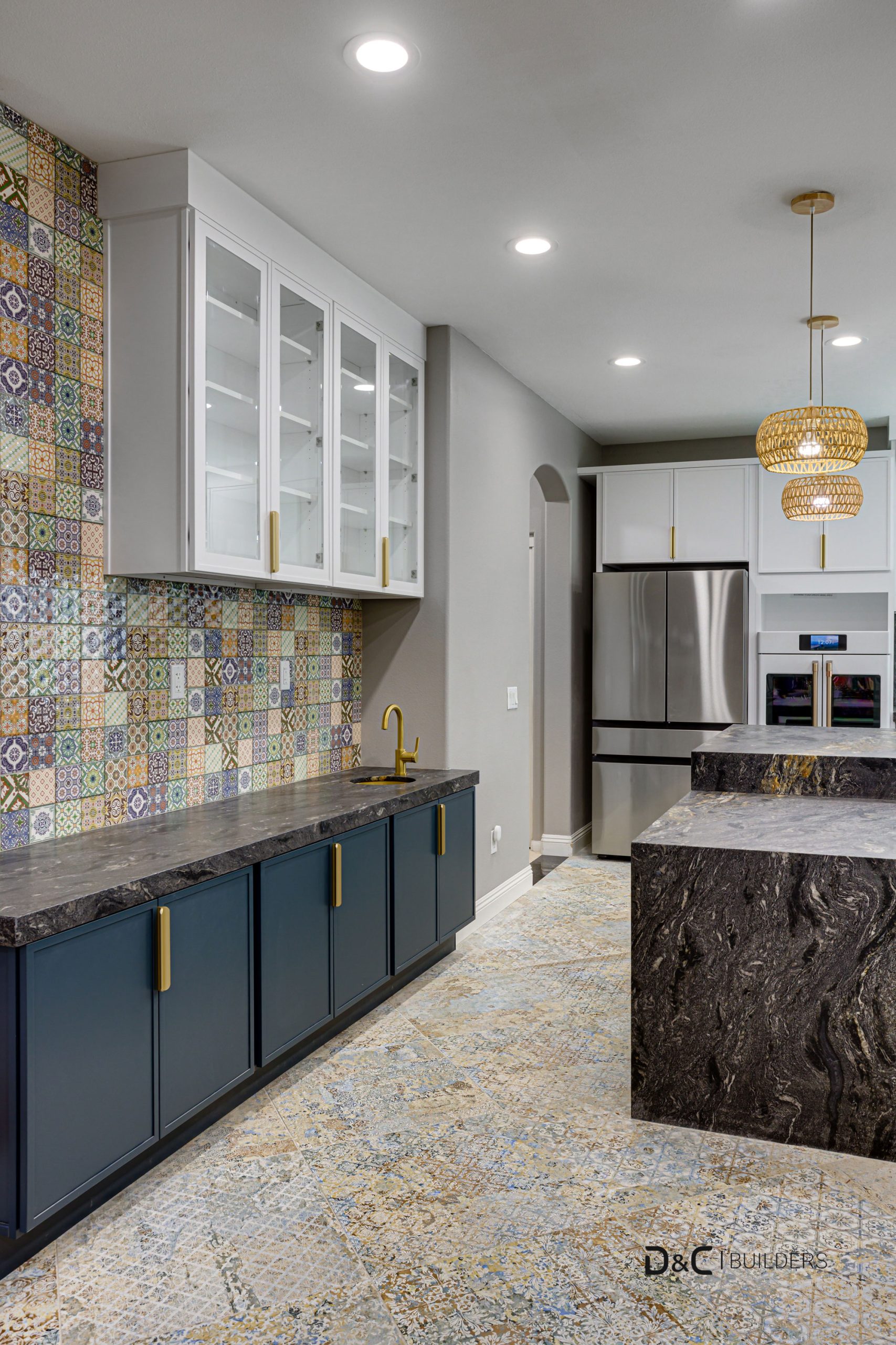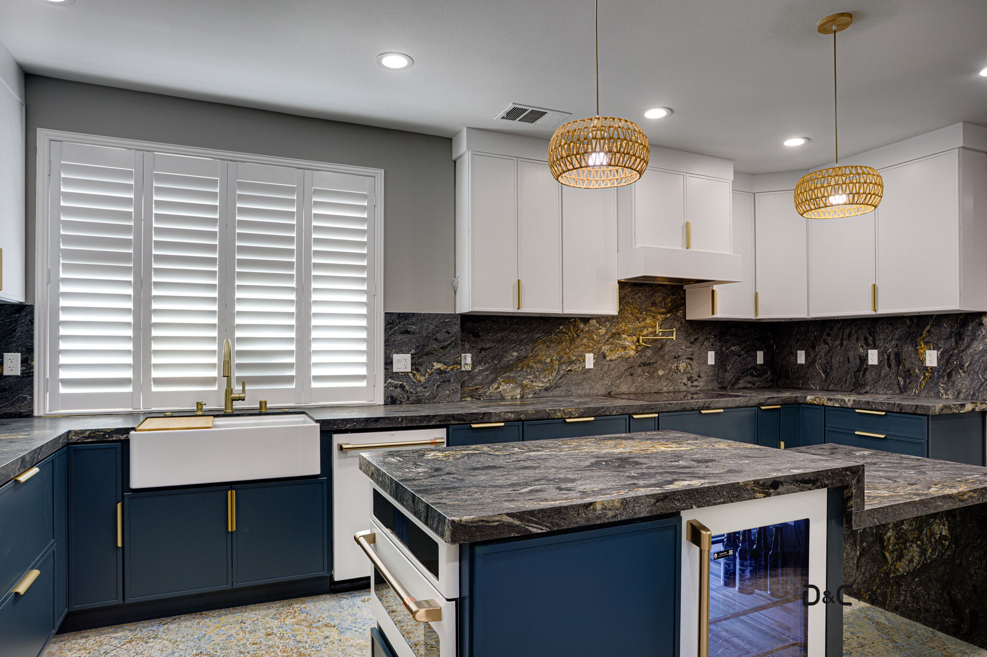 The remodel features dramatic porcelain countertops and full backsplash in black with expressive golden veining, adding visual depth and luxury to the space. The cabinetry follows a timeless shaker style, with crisp white uppers and deep navy lowers that ground the design. Gold-toned fixtures and hardware introduce a warm, elegant contrast, echoed in the light wood pendant fixtures. The farmhouse sink and integrated appliances blend seamlessly with the updated cabinetry. The backsplash includes an accent section with a floral motif that adds a touch of personality, while the tile flooring—matching the backsplash material—creates cohesion throughout the space.